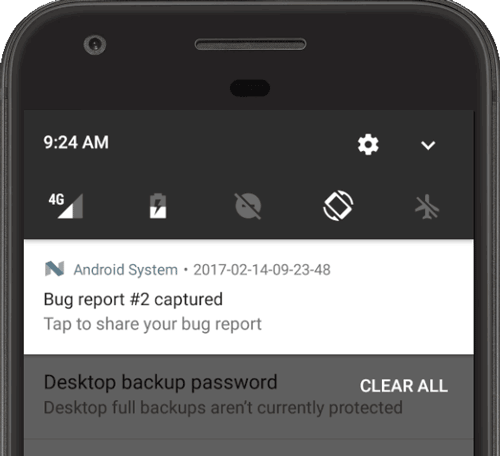 Báo cáo lỗi chứa nhật ký thiết bị, dấu vết ngăn xếp và thông tin chẩn đoán khác để giúp bạn tìm và sửa lỗi trong ứng dụng của mình. Bạn có thể ghi lại báo cáo lỗi từ thiết bị bằng cách sử dụng tuỳ chọn cho nhà phát triển Tạo báo cáo lỗi trên thiết bị, trình đơn của Trình mô phỏng Android hoặc lệnh adb bugreport