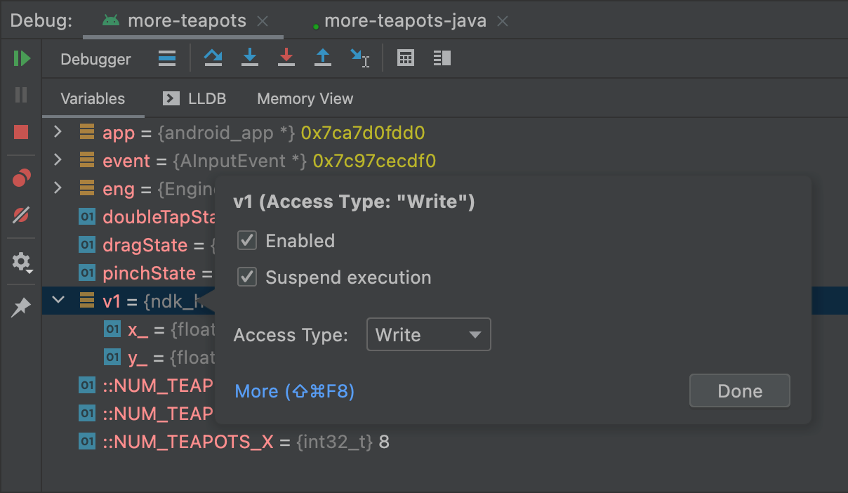 While debugging C/C++ code, you can also set special types of breakpoints, called watchpoints, that can suspend your app process when your app interacts with a particular block of memory. To learn more, read the section about how to add watchpoints.
