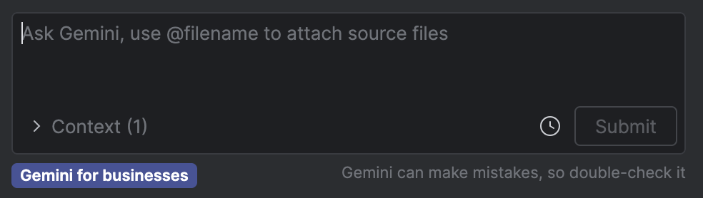 Android Studio'da işletmeler için Gemini'ı kullanırken Gemini araç penceresinin alt kısmında "İşletmeler için Gemini" etiketini görmeniz gerekir.