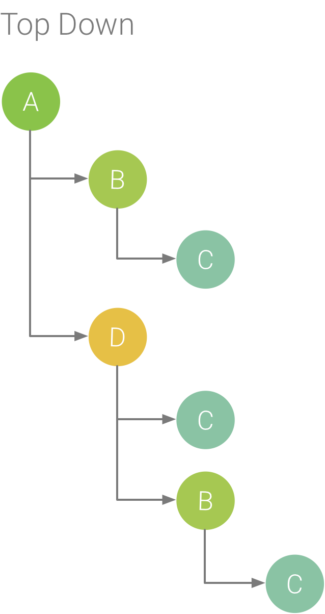 図 2 に示すように、[Top Down] タブでメソッド A のノードを展開すると、その呼び出し先であるメソッド B とメソッド D が表示されます。さらに、メソッド D のノードを展開すると、その呼び出し先であるメソッド B とメソッド C などが表示されます。[Flame Chart] タブの場合と同じように、トップダウン ツリーでは同じコールスタックを共有している同一のメソッドのトレース情報が集約されます。つまり、[Flame Chart] タブの表示は [Top Down] タブをグラフィックで表示したものです。
