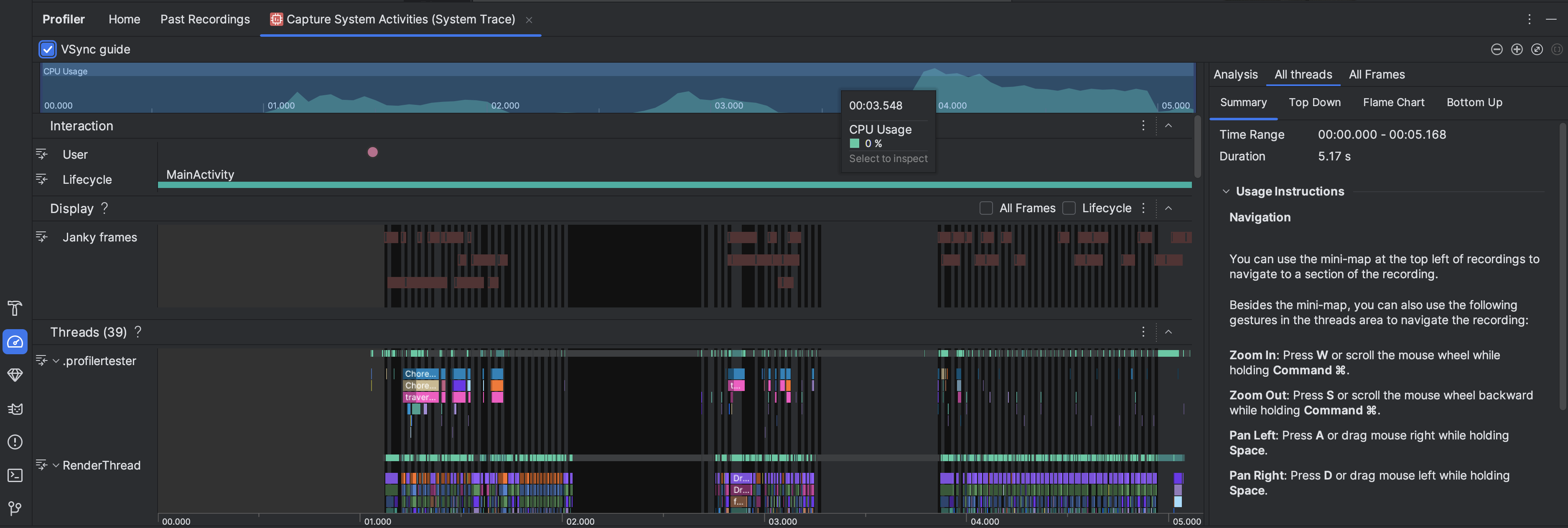 . Info ini berguna untuk menyelidiki hambatan yang menyebabkan jank pada UI dan frekuensi gambar rendah. Threads: Menampilkan thread yang dijalankan aplikasi Anda dan berbagai proses sistem. Untuk mempelajari cara menggunakan rekaman aktivitas sistem guna menyelidiki dan membantu mengurangi jank UI, lihat Mendeteksi jank UI.