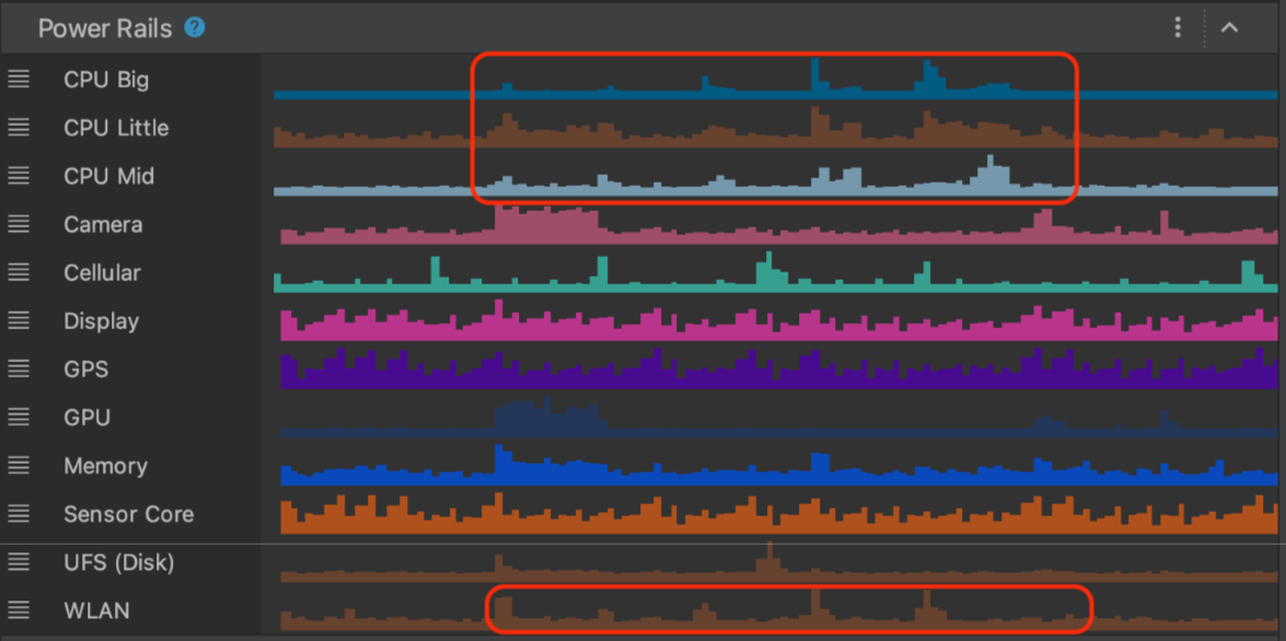 Android Studio Hedgehog से, Power Profiler डिवाइसों पर बैटरी की खपत दिखाता है. इस नए डेटा को, डिवाइस पर मौजूद पावर रेल मॉनिटर (ओडीपीएम) में देखा जा सकता है. यह जानकारी को "पावर रेल" नाम के सबसिस्टम के हिसाब से सेगमेंट करता है. इस्तेमाल किए जा सकने वाले सब-सिस्टम की सूची देखने के लिए, प्रोफ़ाइल बनाने में मदद करने वाली पावर रेल देखें.