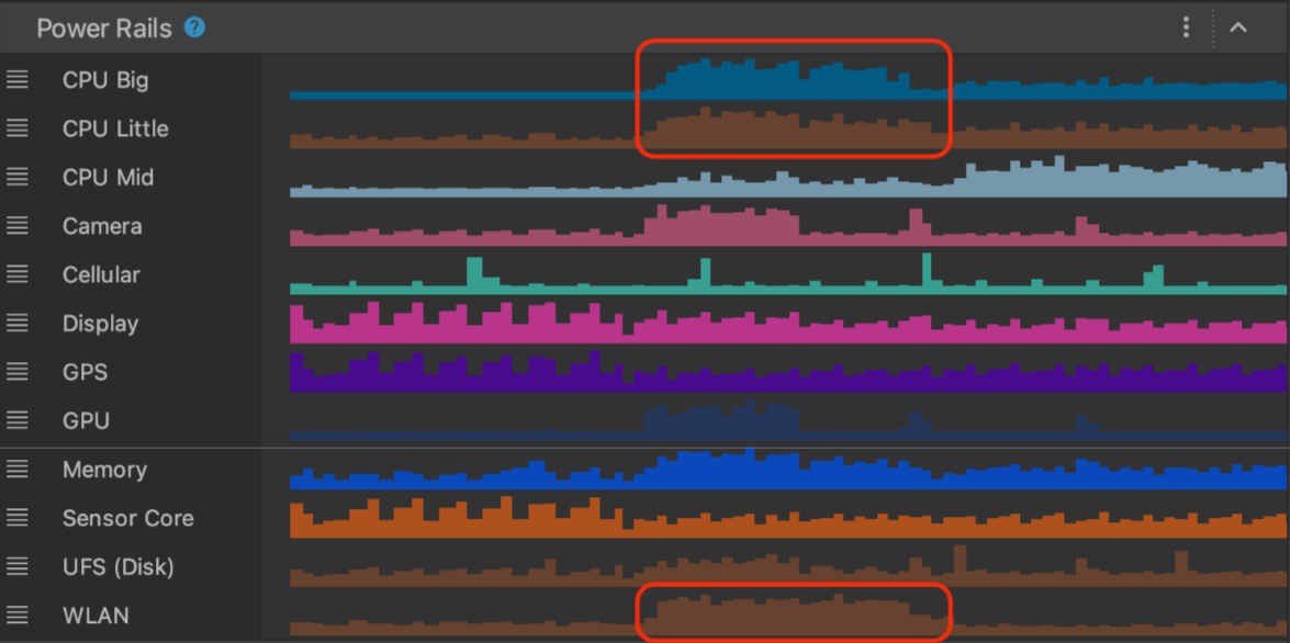 Power Profiler, Android Studio Hedgehog'dan başlayarak cihazlardaki güç tüketimini gösterir. Bu yeni verileri Cihazdaki Power Rails Monitor'da (ODPM) görüntüleyebilirsiniz. Bilgileri "Power Rails" adlı alt sistemlere göre segmentlere ayırır. Desteklenen alt sistemlerin listesi için Profillenebilir güç çubukları bölümüne bakın.
