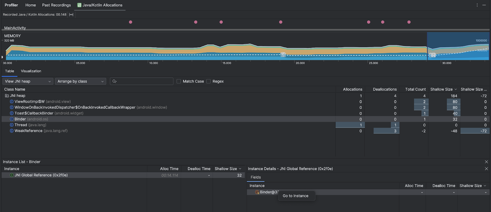 หากต้องการแก้ปัญหาดังกล่าว ให้เลือกดูฮีป JNI ในโปรไฟล์เลอร์เพื่อเรียกดู การอ้างอิง JNI ทั่วโลกทั้งหมด และกรองตามประเภท Java และสแต็กการเรียกเนทีฟ คลิกขวาที่ฟิลด์อินสแตนซ์ในแท็บฟิลด์ แล้วเลือกไปที่ อินสแตนซ์เพื่อดูสแต็กการเรียกการจัดสรรที่เกี่ยวข้อง