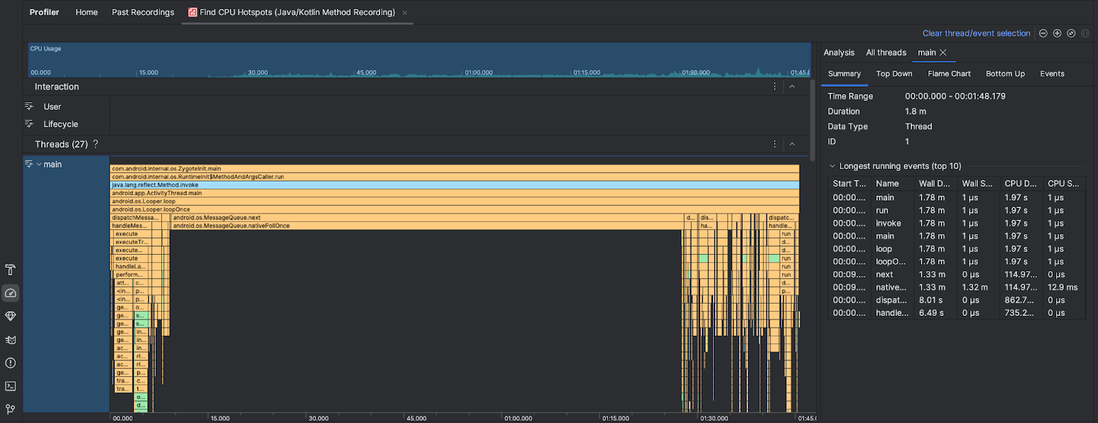 सीपीयू के ज़्यादा इस्तेमाल वाली प्रोसेस ढूंढने का टास्क पूरा होने के बाद, Android Studio Profiler यह जानकारी देता है:
