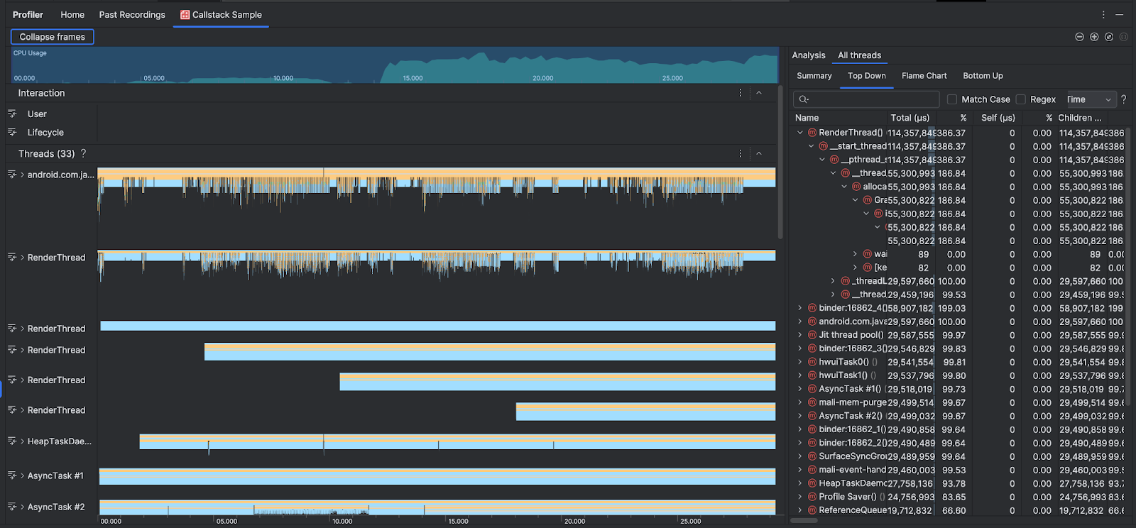 Çağrı yığınını örneklemek için Android Studio Profiler Ana Sayfa sekmesinden CPU Hotspot'larını Bul (Çağrı Yığını Örneği) görevini seçin. Kayıt ayrıştırıldıktan sonra aşağıdaki görselleri görürsünüz: