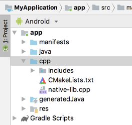 のビルド スクリプト、ビルド済みのライブラリがあります。新しいプロジェクトでは、Android Studio によってサンプルの C++ ソースファイルである native-lib.cpp