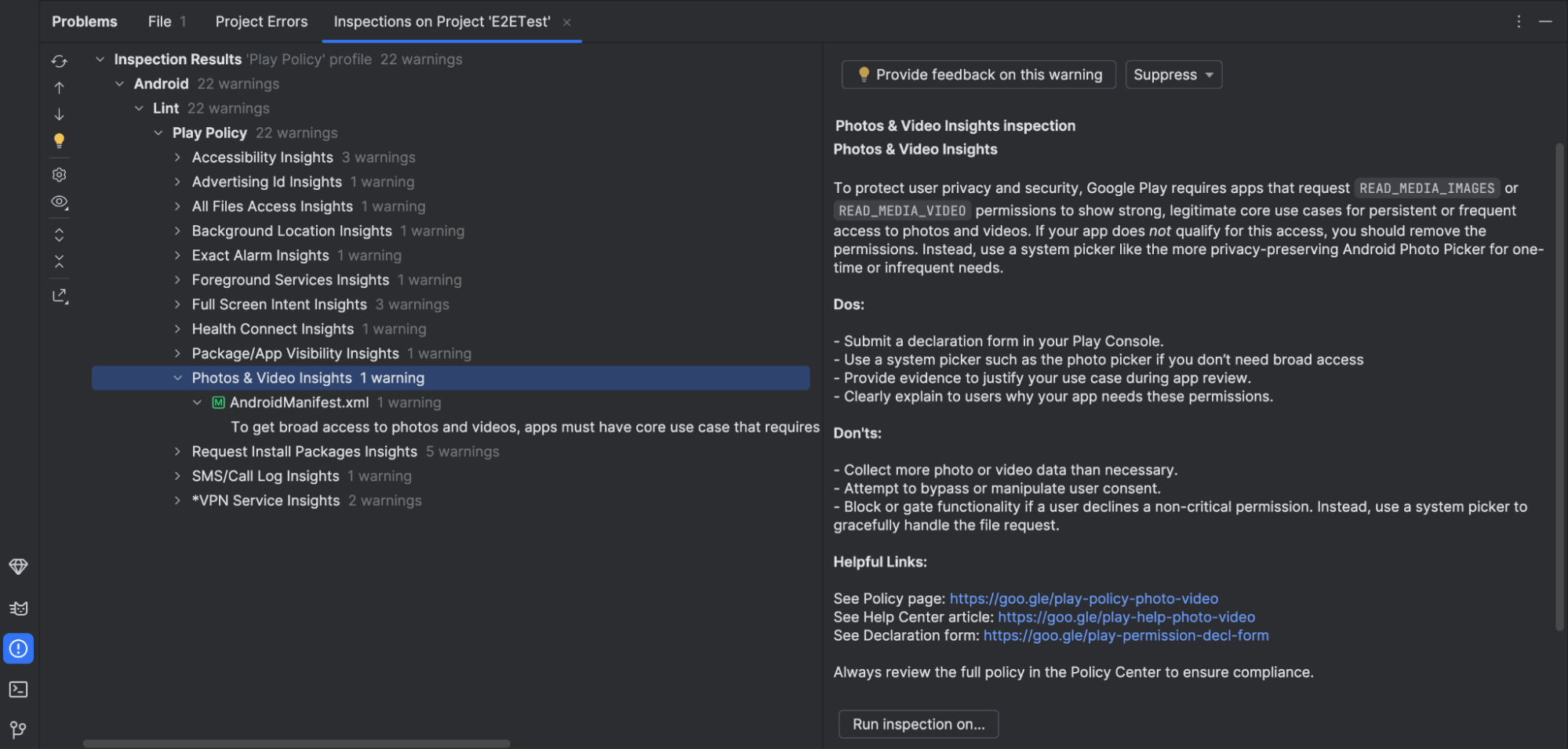 Para ver si hay estadísticas de políticas de Play para tu proyecto, ve a Code > Inspect for Play Policy Insights. Las estadísticas aparecen en la ventana de la herramienta Problems y también como advertencias de lint en los archivos correspondientes.