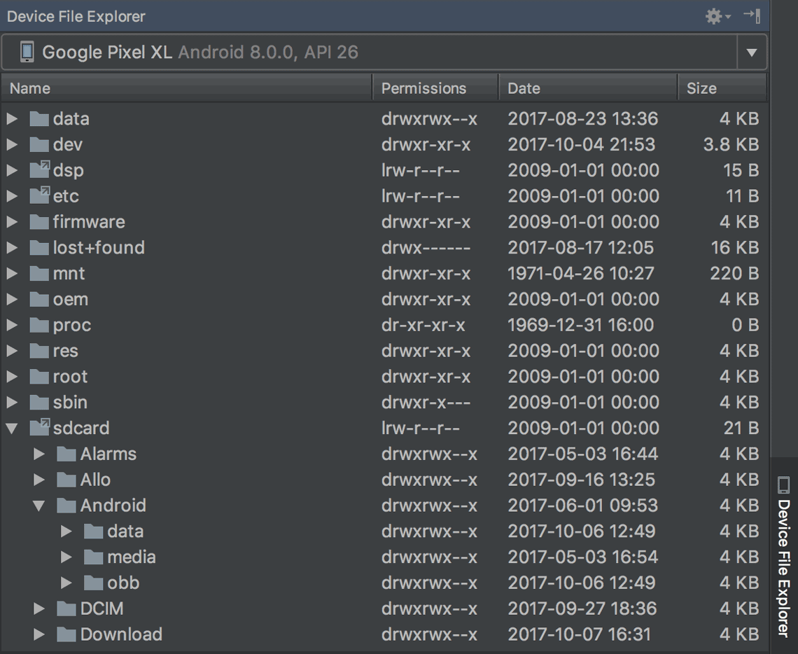 डिवाइस फ़ाइल एक्सप्लोरर की नई सुविधा की मदद से, कनेक्ट किए गए डिवाइस के फ़ाइल सिस्टम की जांच की जा सकती है. साथ ही, डिवाइस और कंप्यूटर के बीच फ़ाइलें ट्रांसफ़र की जा सकती हैं. यह DDMS में उपलब्ध फ़ाइल सिस्टम टूल की जगह ले लेता है.