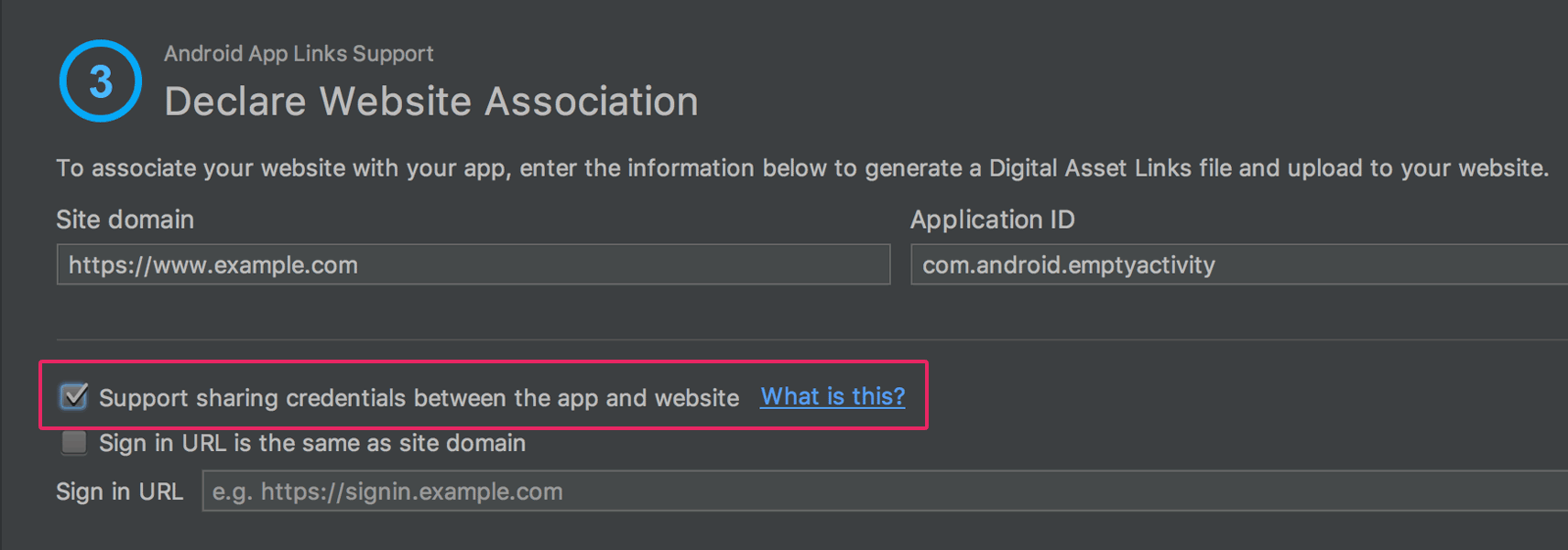डिजिटल ऐसेट लिंक फ़ाइल बनाएं. इसमें सही ऑब्जेक्ट एंट्री शामिल करें, ताकि Google Smart Lock काम कर सके. साथ ही, अपनी मेनिफ़ेस्ट फ़ाइल में इससे जुड़ा