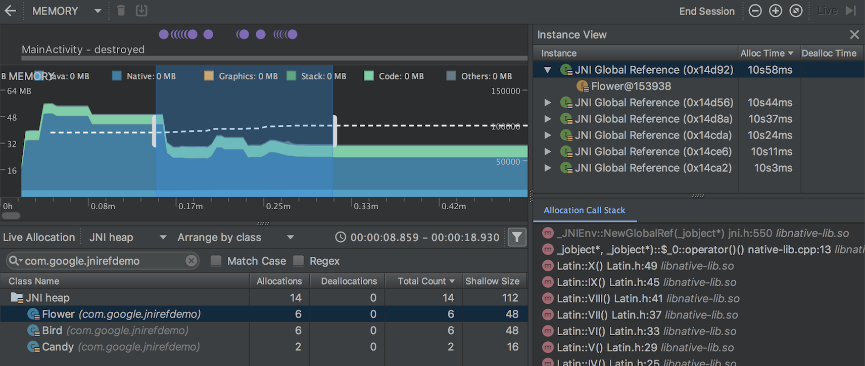 Mientras se esté ejecutando la app, selecciona una parte del cronograma que quieras inspeccionar y elige JNI heap en el menú desplegable de la parte superior de la lista de clases, como se muestra más abajo. Podrás inspeccionar los objetos de la pila como lo harías normalmente y hacer doble clic en ellos en la pestaña Allocation Call Stack para ver dónde se asignan y publican las referencias de JNI en tu código.