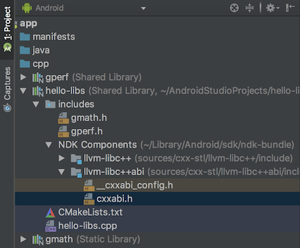 Se você já inclui código e bibliotecas C/C++ no seu projeto, abra a janela Project no lado esquerdo do ambiente de desenvolvimento integrado, selecionando View > Tool Windows > Project no menu principal, e escolha Android no menu suspenso. No diretório cpp, todos os cabeçalhos que estão dentro do escopo do seu projeto de app são organizados no nó include de cada uma das dependências da biblioteca C/C++ local, conforme mostrado abaixo.
