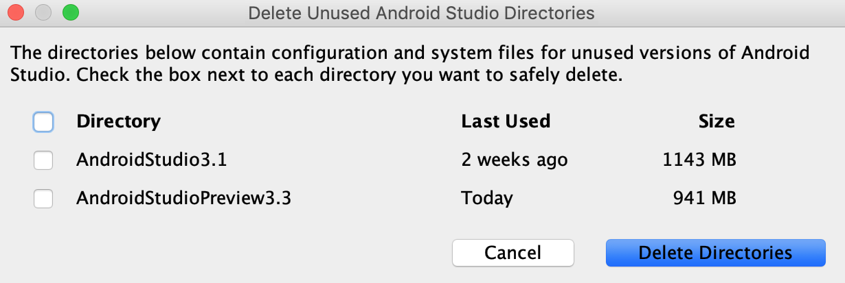 Android Studio के मुख्य वर्शन को पहली बार चलाने पर, यह उन डायरेक्ट्री को खोजता है जिनमें Android Studio के उन वर्शन के लिए कैश मेमोरी, सेटिंग, इंडेक्स, और लॉग मौजूद होते हैं जिनके लिए कोई इंस्टॉलेशन नहीं मिला है. इसके बाद, इस्तेमाल नहीं की गई Android Studio डायरेक्ट्री मिटाएं डायलॉग में, इस्तेमाल नहीं की गई इन डायरेक्ट्री की जगहें, साइज़, और आखिरी बार बदलाव किए जाने का समय दिखता है. साथ ही, इन्हें मिटाने का विकल्प भी मिलता है.