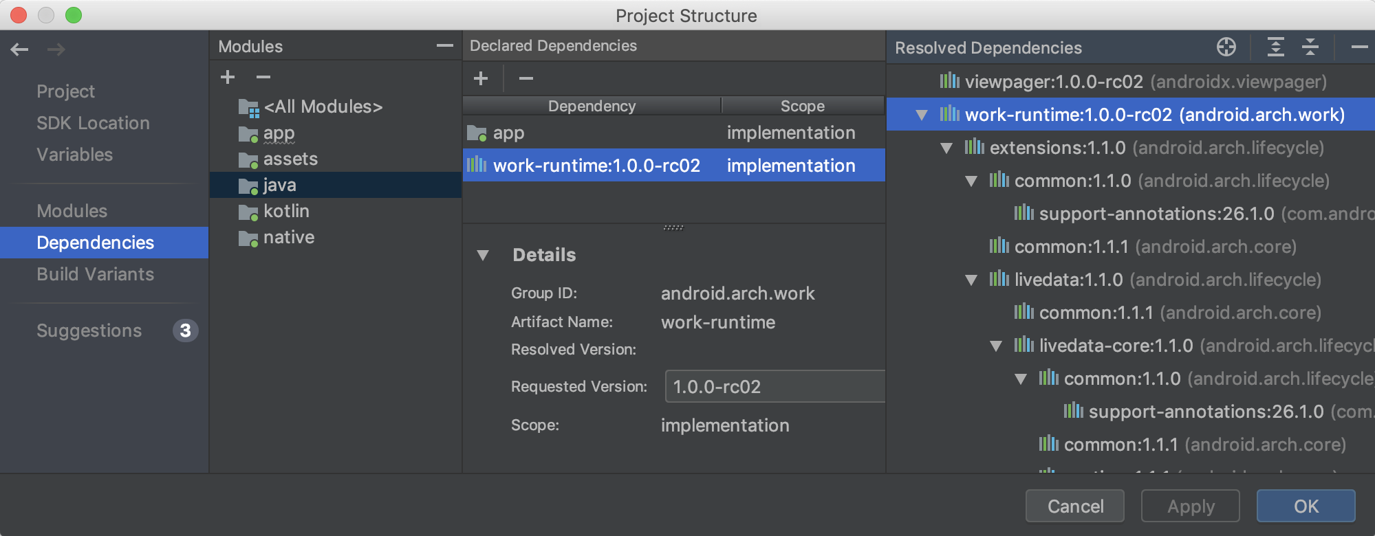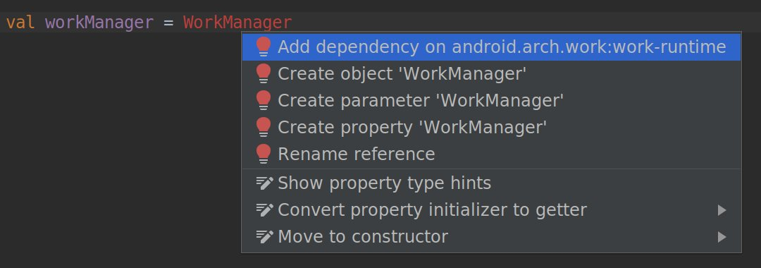 إذا بدأت في استخدام بعض فئات Jetpack وFirebase في الرمز البرمجي، سيقترح عليك إجراء جديد إضافة تبعية مكتبة Gradle المطلوبة إلى مشروعك، إذا لم يسبق لك إجراء ذلك. على سبيل المثال، إذا أشرت إلى الفئة WorkManager