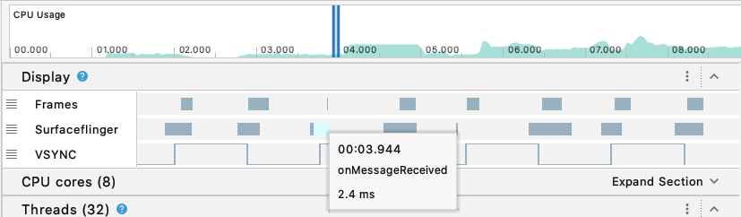 ডিসপ্লে ডেটা: ডিসপ্লে বিভাগে, SurfaceFlinger এবং VSYNC-এর জন্য নতুন টাইমলাইনগুলি আপনাকে আপনার অ্যাপের UI-তে রেন্ডারিং সমস্যাগুলি তদন্ত করতে সহায়তা করে।