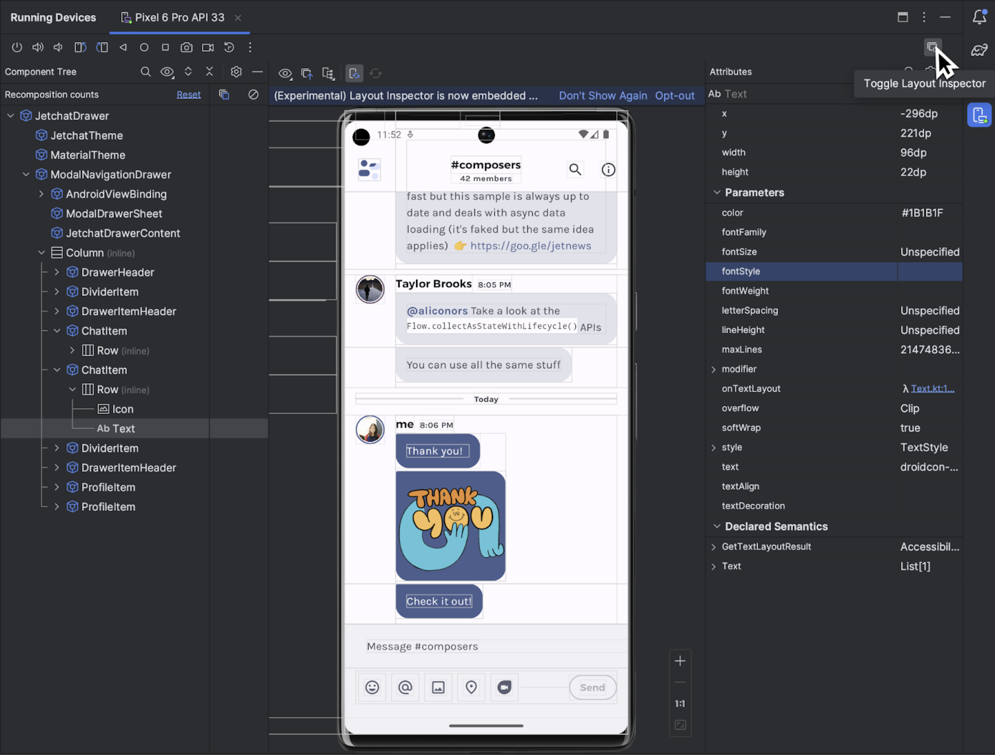 Ab Android Studio Hedgehog Canary 2 können Sie den Layout Inspector direkt im Fenster mit dem Tool Laufgeräte Diese experimentelle Funktion spart und können Ihren UI-Debugging-Workflow in einem einzigen Tool-Fenster organisieren. In Im eingebetteten Modus können Sie eine Ansichtshierarchie anzeigen lassen und die Eigenschaften der einzelnen Layout Inspector-Funktionen ansehen und darauf zugreifen. So greifen Sie auf den gesamten Satz zu: müssen Sie den Layout Inspector trotzdem in einem eigenständigen Fenster ausführen, (Datei > Einstellungen > Experimentell > Layout Inspector unter Windows oder Android Studio > Einstellungen > Experimentell > Layout Inspector unter macOS).