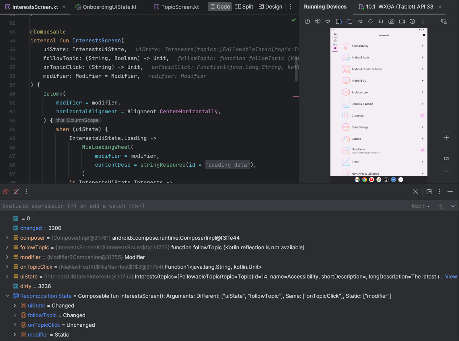 जब आपके Compose के यूज़र इंटरफ़ेस (यूआई) के कुछ हिस्से अचानक फिर से दिखते हैं, तो कभी-कभी उनमें मुश्किल होती है इसकी वजह समझने के लिए. अब, कंपोज़ेबल फ़ंक्शन पर ब्रेकपॉइंट सेट करते समय, डीबगर, कंपोज़ेबल और उनके पैरामीटर की सूची बनाता है ताकि आप उन बदलावों की वजह आसानी से समझ सकें शॉर्ट वीडियो में बदलाव करना. उदाहरण के लिए, जब कंपोज़ेबल पर रोका जाता है, तो डीबगर आपको यह बताता है कि किन पैरामीटर में "बदलाव" हुआ है या "इसमें कोई बदलाव न किया गया हो", ताकि आप उन्हें दोबारा बनाने की वजह की ज़्यादा बेहतर ढंग से जांच कर सकें.