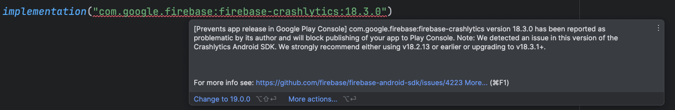 Android Studio 现在还会直接在编辑器中显示 SDK 作者的备注,以节省您的时间。当有推荐版本或版本范围可用时,Android Studio 还会提供快速修复: