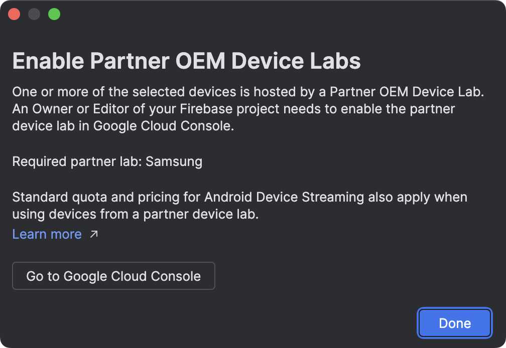 Google ক্লাউড কনসোলে অংশীদার ডিভাইস ল্যাবস পৃষ্ঠায় প্রতিটি অংশীদার ল্যাব সক্ষম করতে প্রকল্পের একজন সম্পাদক বা মালিকের প্রয়োজন৷ একটি অংশীদার ল্যাব কিভাবে সক্ষম করবেন তা এখানে: