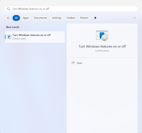 Naciśnij klawisz Enter lub kliknij Włącz lub wyłącz funkcje systemu Windows, aby otworzyć panel sterowania.