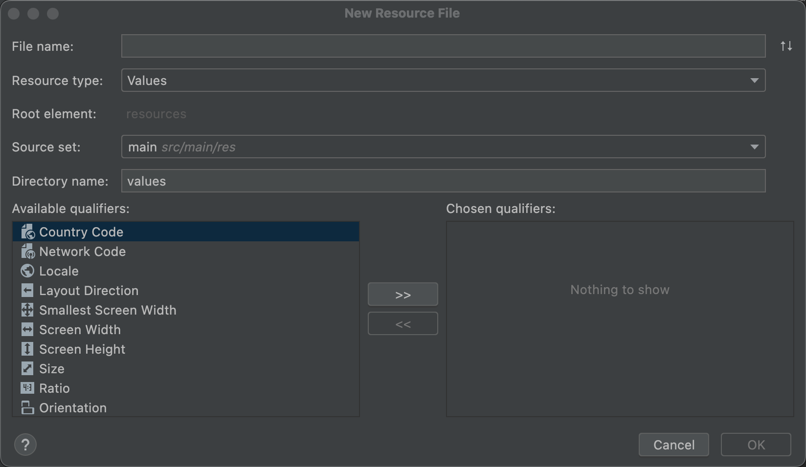 - Nome directory: il nome della directory deve essere specifico al tipo di risorsa e alla combinazione di qualificatori di configurazione. Azioni sconsigliate modificare questo campo, a meno che tu non voglia aggiungere qualificatori di configurazione manualmente il nome della directory (utilizza invece Qualificatori disponibili).