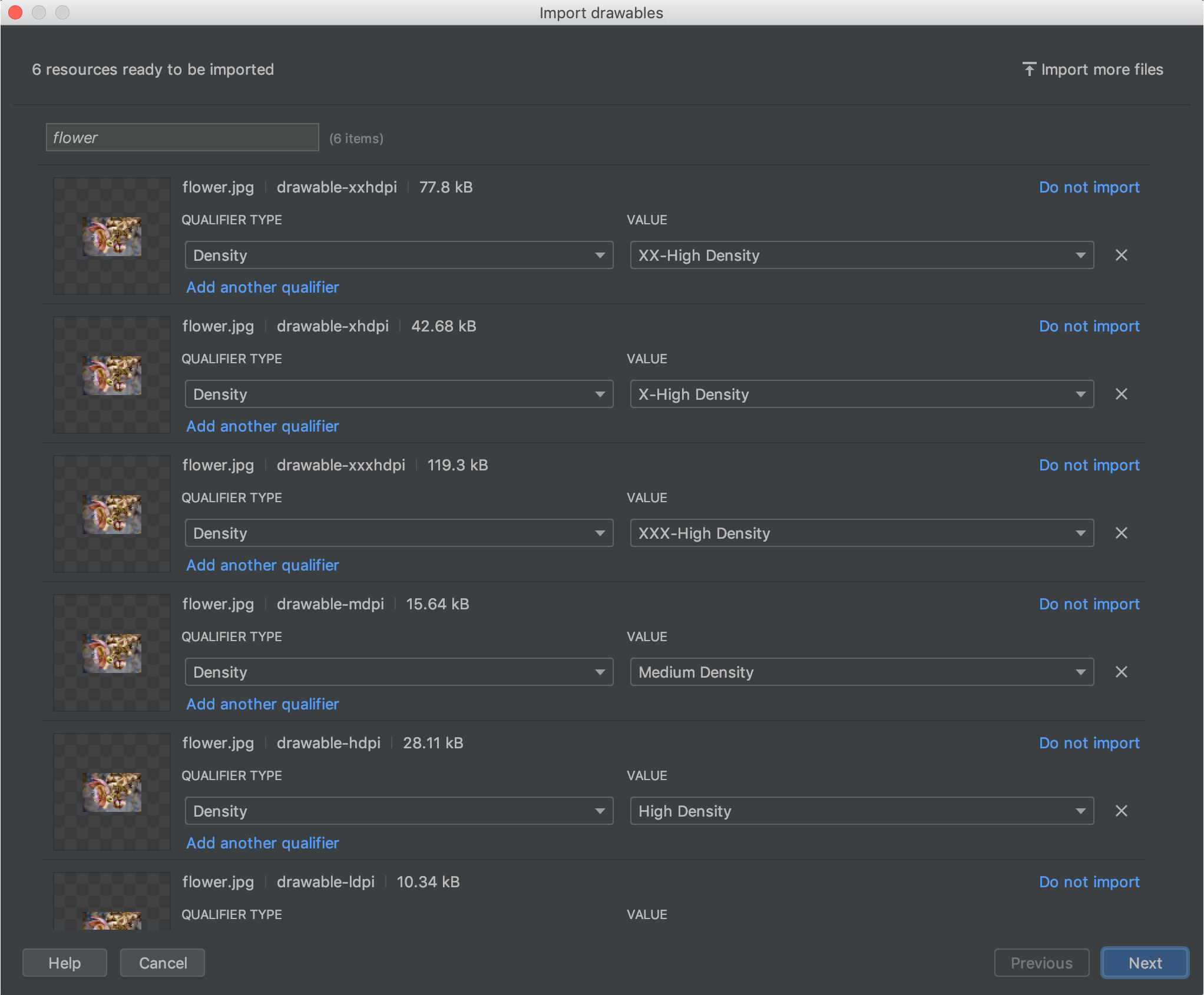 किसी फ़ाइल या फ़ोल्डर को इंपोर्ट करने पर, अगर उसके पाथ में डेंसिटी क्वालिफ़ायर मौजूद है, तो Resource Manager उसे इंपोर्ट करने की प्रोसेस के दौरान अपने-आप लागू कर देता है. Resource Manager, Android के डेनसिटी क्वालिफ़ायर और iOS के स्केल फ़ैक्टर, दोनों को पार्स कर सकता है.