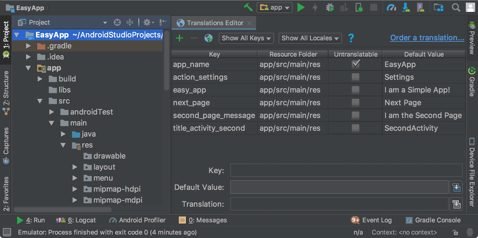 <resources> <string name="app_name" translatable="false">EasyApp</string> <string name="action_settings">Settings</string> <string name="easy_app">I am a Simple App!</string> <string name="next_page">Next Page</string> <string name="second_page_message">I am the Second Page!</string> <string name="title_activity_second">SecondActivity</string> </resources>