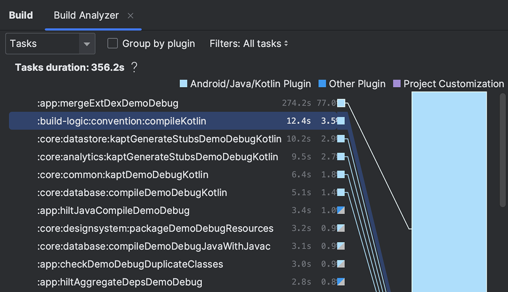 Система сборки Android Studio, основанная на Gradle, позволяет вам настроить сборку для создания нескольких вариантов сборки для разных устройств Android из одного проекта. Затем проанализируйте производительность своих сборок и выясните, где в вашем проекте существуют потенциальные проблемы сборки с помощью Build Analyzer.