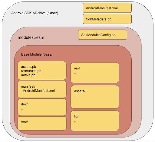 SdkBundleConfig.pb: প্রোটো ফরম্যাটে একটি কনফিগারেশন ফাইল, যাতে রানটাইম-সক্ষম SDK-এর তালিকা থাকে যার উপর আপনার SDK নির্ভর করে। সম্পূর্ণ সংজ্ঞার জন্য,sdk_bundle_config.protoফাইলটি দেখুন।modules.resm: একটি জিপ ফাইল যাতে SDK থেকে APK গুলি তৈরি করার জন্য প্রয়োজনীয় সমস্ত ডেটা রয়েছে৷SdkModulesConfig.pb: প্রোটো ফরম্যাটে একটি কনফিগারেশন ফাইল। এই ফাইলটিতে ফ্রেমওয়ার্কের জন্য SDK এন্ট্রি পয়েন্টের SDK নাম, সংস্করণ এবং শ্রেণীর নাম রয়েছে (SandboxedSdkProvider)৷ সম্পূর্ণ সংজ্ঞার জন্য,sdk_modules_config.protoফাইলটি দেখুন।base/: SDK কোড এবং সংস্থান ধারণকারী একক মডিউল।-