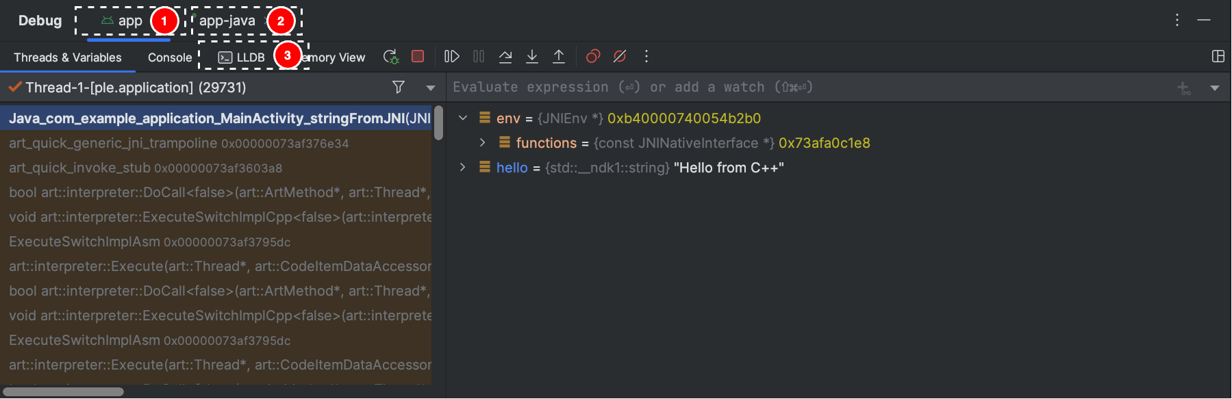 - Android Studio affiche l'onglet <your-module> lorsque le débogueur LLDB rencontre un point d'arrêt dans votre code C/C++. Les volets "Frames", "Variables" et "Watches" (Points d'observation) sont également disponibles et fonctionnent exactement comme si vous déboguiez du code Java.