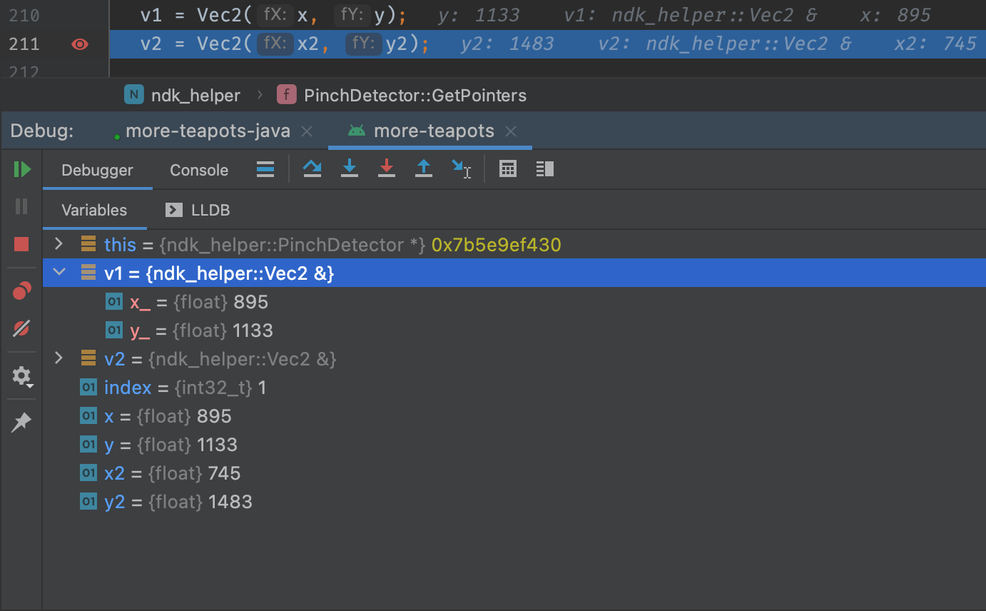Android Studio associe deux débogueurs (Java et LLDB) à votre processus d'application, vous permettant d'inspecter les points d'arrêt dans votre code Java et natif sans redémarrer votre application ni modifier votre configuration de débogage.