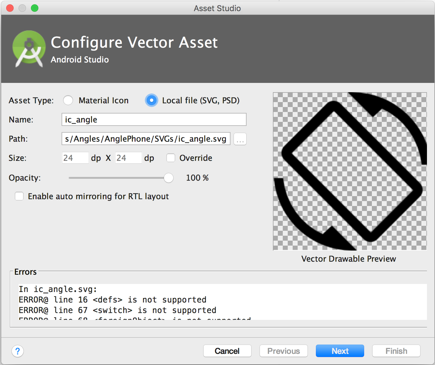 অ্যান্ড্রয়েড 4.4 (এপিআই লেভেল 20) এবং নিম্ন ভেক্টর ড্রয়েবল সমর্থন করে না। যদি আপনার ন্যূনতম API স্তরটি এই API স্তরগুলির একটিতে সেট করা থাকে তবে ভেক্টর অ্যাসেট স্টুডিও ব্যবহার করার সময় আপনার কাছে দুটি বিকল্প রয়েছে: পোর্টেবল নেটওয়ার্ক গ্রাফিক (পিএনজি) ফাইলগুলি (ডিফল্ট) তৈরি করুন বা সমর্থন লাইব্রেরি ব্যবহার করুন৷