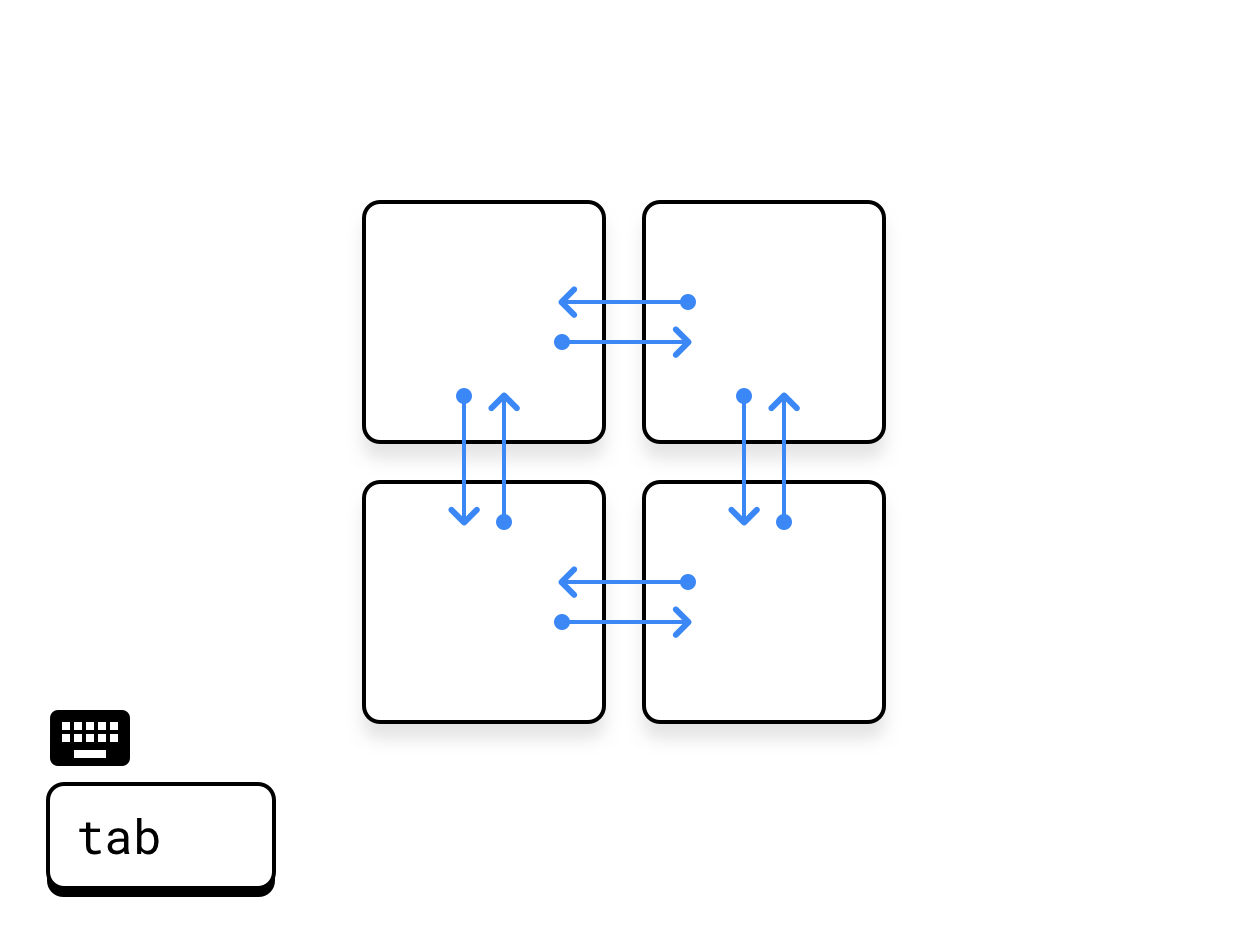 - Remove or modify floating action buttons (FABs) for better keyboard navigation. By default, a FAB positions last in transversal tabbing order. Instead, make it first, because it is the primary action, or replace it with another, higher-level affordance.
