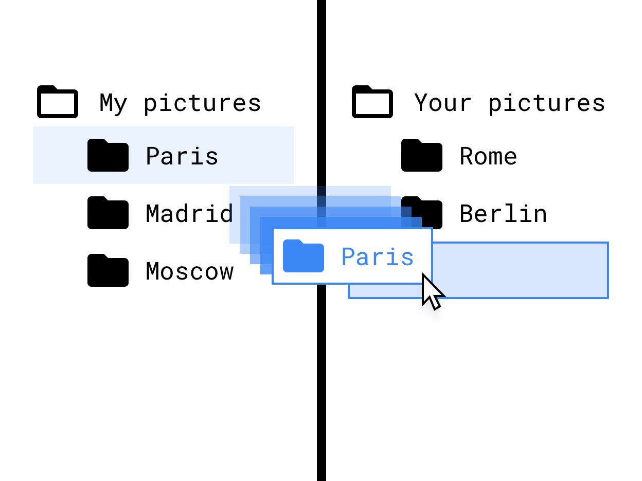 次の図のようなドラッグ&ドロップ操作を構築すると、効率的で直感的な生産性向上機能をアプリに導入できます。詳細については、 ドラッグ&ドロップをご覧ください。