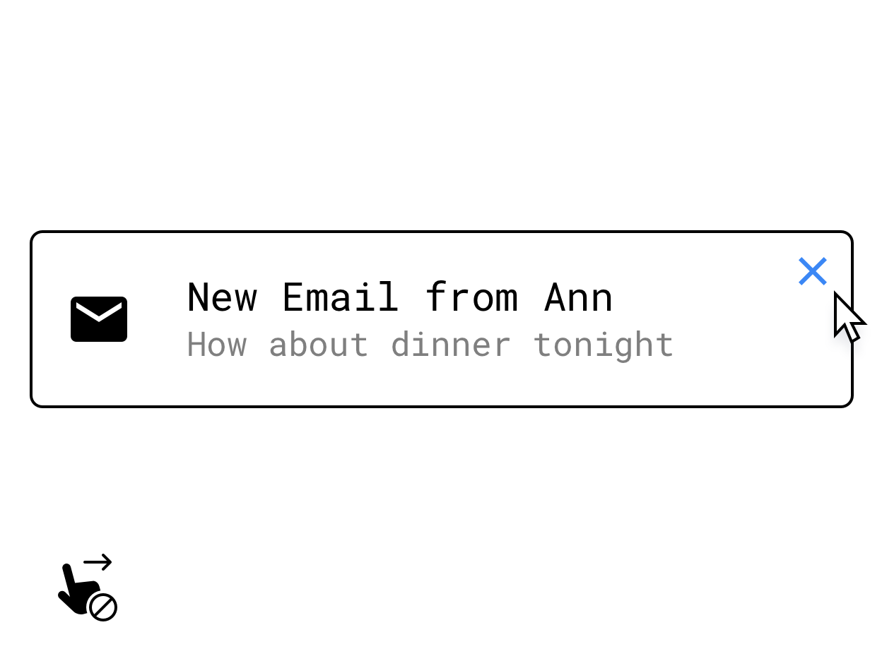 タップ&ホールド アクション、スワイプ、マルチタップ操作など、タッチスクリーン固有の操作が割り当てられた基本機能について、キーボードやマウスによる代替操作を割り当てる必要があります。たとえば、サーフェスにカーソルを合わせるとボタンが表示されるようにする、などの対応が考えられます。