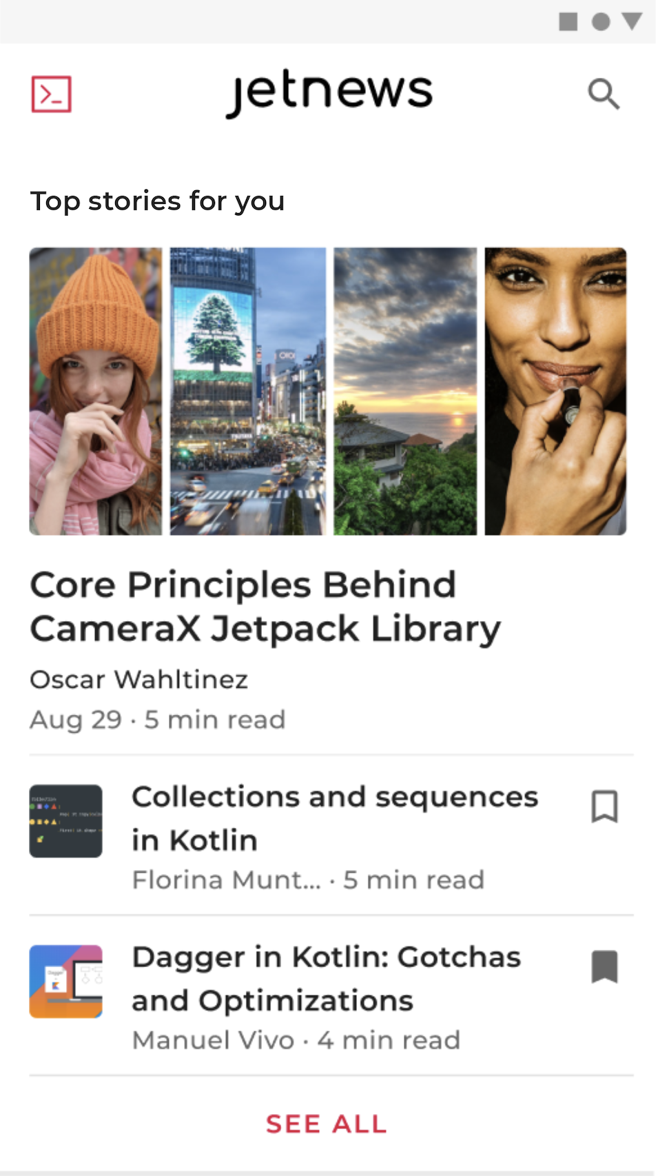 Pada kasus terakhir, implementasi standarnya adalah instance ViewModel, meskipun bergantung pada persyaratan aplikasi, class sederhana mungkin sudah cukup. Misalnya, aplikasi Berita dari studi kasus menggunakan class NewsViewModel sebagai holder status untuk menghasilkan status UI untuk layar yang ditampilkan di bagian tersebut.