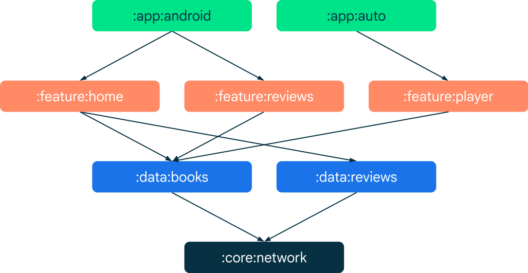 | Réutilisation | La modularisation permet de partager du code et de créer plusieurs applications à partir de la même base. Les modules sont des composants fondamentaux. Les applications doivent être une somme de leurs fonctionnalités, sous forme de modules distincts. Les fonctionnalités fournies par un module donné peuvent être activées ou non dans une application spécifique. Par exemple, :feature:news peut faire partie du type de version complet et de l'application Wear, mais ne peut pas faire partie du type de version de démonstration. |