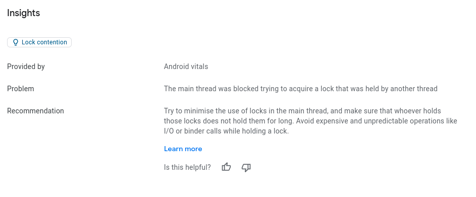 Play Vitals kann einige dieser häufigen ANR-Ursachen erkennen und bei der Fehlerbehebung helfen. Für Wenn z. B. ein ANR-Fehler aufgrund eines Sperrkonflikts erkannt wird, können Sie das Problem und die empfohlene Problembehebung im Bereich ANR-Statistiken zusammenfassen.