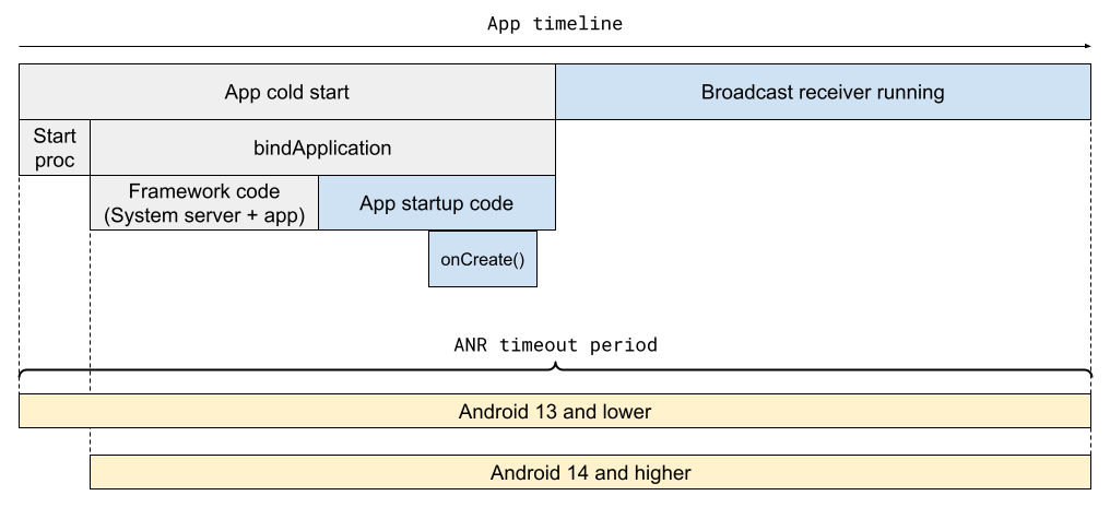 Ilustracja poniżej przedstawia oś czasu ANR odbiornika komunikatów określonych procesów aplikacji.
