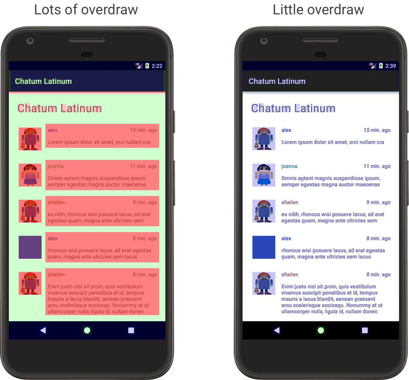 Otra función de las opciones para desarrolladores te ayuda a identificar superposiciones mediante la codificación por color de tu IU. La superposición se produce cuando tu app dibuja el mismo píxel más de una vez dentro del mismo fotograma. Por lo tanto, en esta visualización, se muestran los puntos en que tu app podría realizar más trabajo de renderización de lo que se necesita, lo que puede ser un problema de rendimiento debido al esfuerzo adicional que realiza la GPU para renderizar píxeles que el usuario no podrá ver. Por lo tanto, debes corregir los eventos de superposición siempre que sea posible.