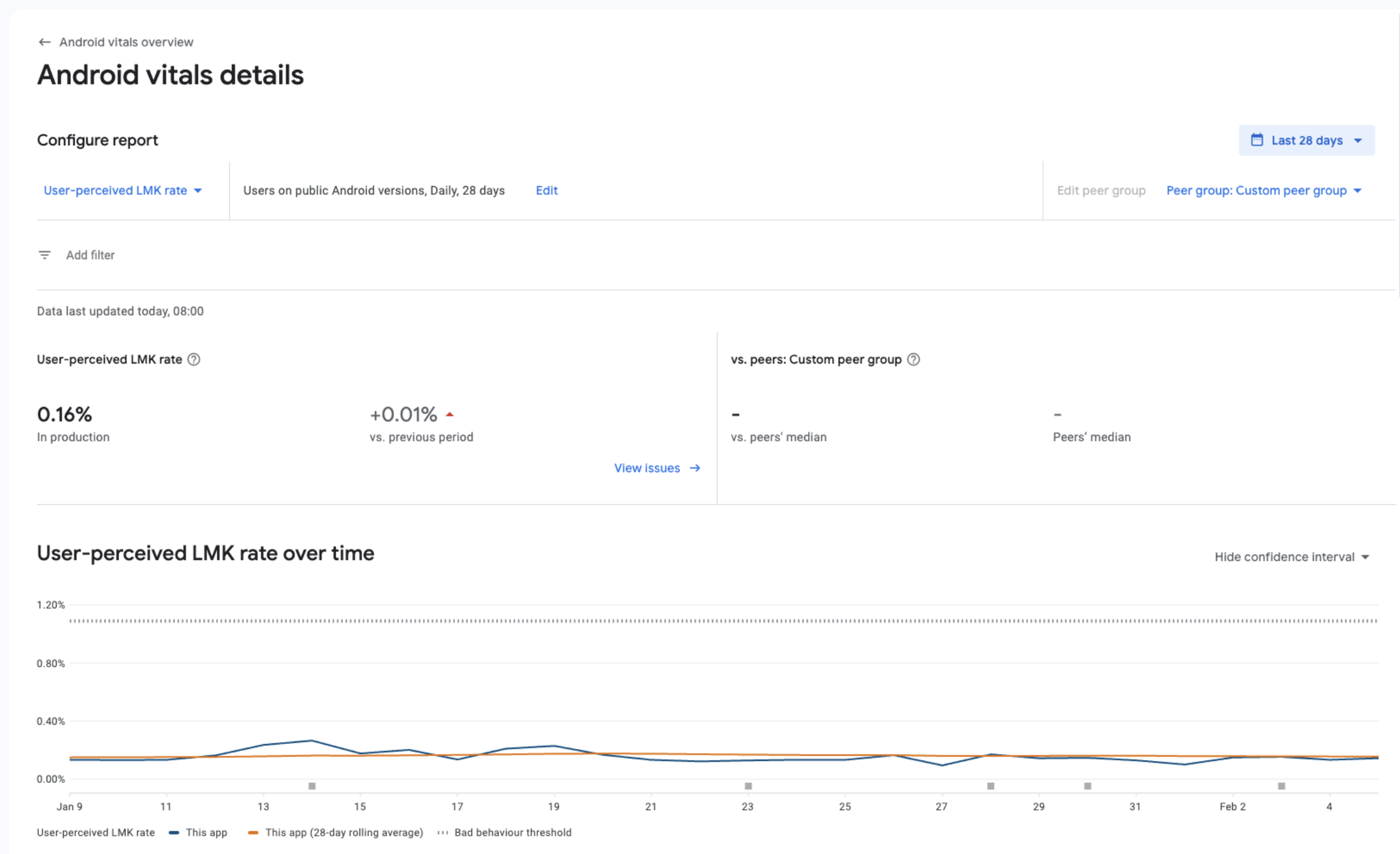 Android vitals می تواند به شما در نظارت و بهبود نرخ LMK برنامه کمک کند. Android vitals تنها یک نرخ LMK را اندازه‌گیری می‌کند: نرخ LMK درک شده توسط کاربر .