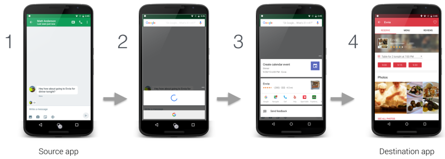 চিত্র 1. Google অ্যাপের Now অন ট্যাপ বৈশিষ্ট্যের সাথে সহকারী ইন্টারঅ্যাকশন উদাহরণ৷