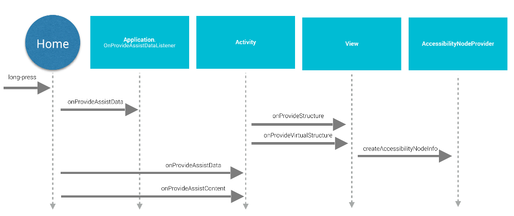 বিশ্বব্যাপী অ্যাপ্লিকেশন প্রসঙ্গ প্রদান করতে, অ্যাপটি Application.OnProvideAssistDataListener এর একটি বাস্তবায়ন তৈরি করে এবং registerOnProvideAssistDataListener() ব্যবহার করে এটি নিবন্ধন করে। ক্রিয়াকলাপ-নির্দিষ্ট প্রাসঙ্গিক তথ্য প্রদান করতে, ক্রিয়াকলাপটি onProvideAssistData() এবং onProvideAssistContent() ওভাররাইড করে। ঐচ্ছিক গ্লোবাল কলব্যাক আহ্বান করার পরে দুটি কার্যকলাপ পদ্ধতি বলা হয়। যেহেতু কলব্যাকগুলি মূল থ্রেডে কার্যকর হয়, সেগুলি অবিলম্বে সম্পূর্ণ করা উচিত৷ কলব্যাকগুলি শুধুমাত্র তখনই আহ্বান করা হয় যখন কার্যকলাপ চলছে