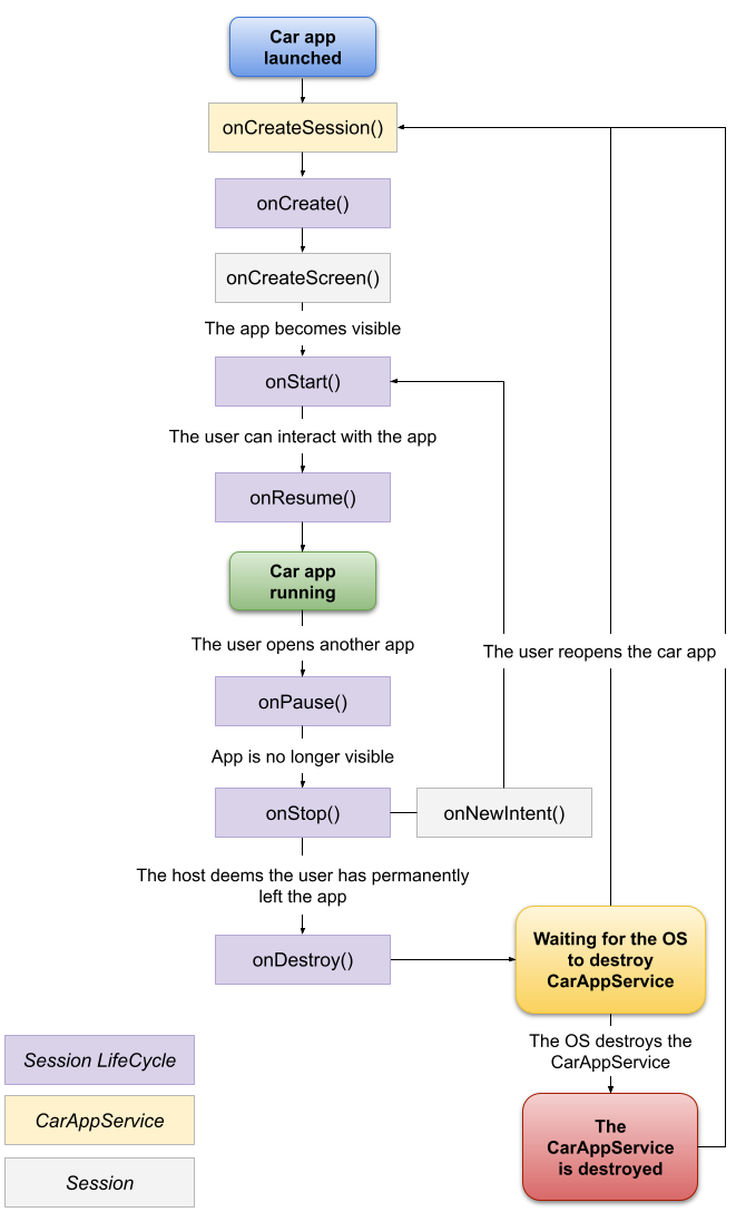 Session یک کلاس انتزاعی است که برنامه شما باید آن را پیاده سازی کند و با استفاده از CarAppService.onCreateSession آن را برگرداند. این به عنوان نقطه ورود برای نمایش اطلاعات بر روی صفحه نمایش ماشین عمل می کند. این یک چرخه عمر دارد که وضعیت فعلی برنامه شما را در صفحه ماشین، مانند زمانی که برنامه شما قابل مشاهده یا پنهان است، اطلاع می دهد.