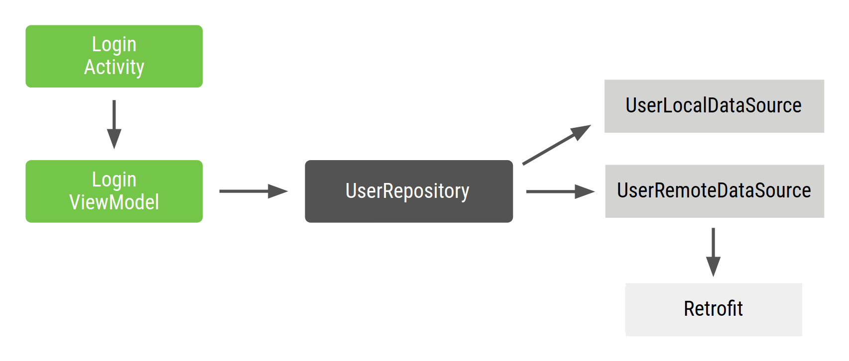 class UserRepository( private val localDataSource: UserLocalDataSource, private val remoteDataSource: UserRemoteDataSource ) { ... } class UserLocalDataSource { ... } class UserRemoteDataSource( private val loginService: LoginRetrofitService ) { ... }