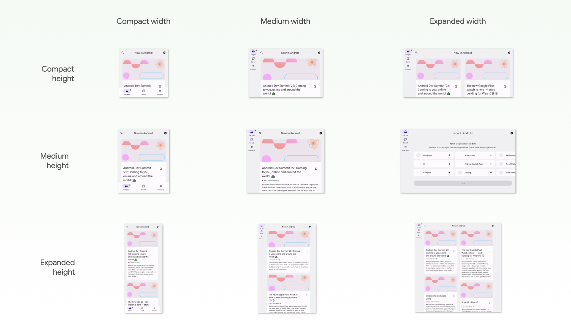 Whether you customize UIs for different window sizes or not, you should verify that the UIs are displayed correctly. Take into account widths and heights that are compact, medium, and extended. See Window size classes for the recommended breakpoints.