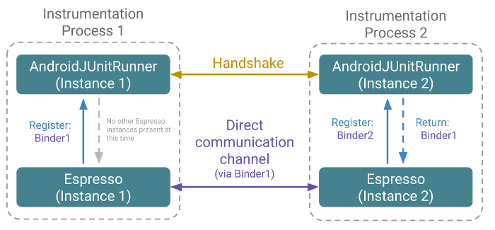 3. As duas instâncias de AndroidJUnitRunner realizam um handshake para estabelecer uma conexão entre si. Ao mesmo tempo, cada instância de AndroidJUnitRunner conecta todos os clientes registrados, como o Espresso, com os respectivos correspondentes em outros processos. Assim, esses clientes podem formar um canal de comunicação direta entre si.