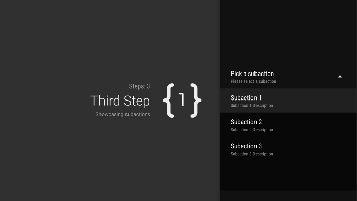 @Override public void onCreateActions(List<GuidedAction> actions, Bundle savedInstanceState) { ... actions.add(new GuidedAction.Builder() .id(SUBACTIONS) .title(getString(R.string.guidedstep_subactions_title)) .description(getString(R.string.guidedstep_subactions_desc)) .subActions(subActions) .build()); ... }