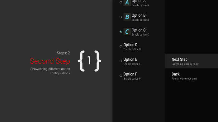 @Override public void onCreateActions(List<GuidedAction> actions, Bundle savedInstanceState) { // Add "Continue" user action for this step actions.add(new GuidedAction.Builder() .id(CONTINUE) .title(getString(R.string.guidedstep_continue)) .description(getString(R.string.guidedstep_letsdoit)) .hasNext(true) .build()); ...