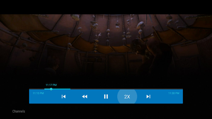 L'utilisateur peut mettre en pause le contenu d'un programme, effectuer un retour arrière ou une avance rapide en accédant au les commandes de lecture de la chaîne, soit en appuyant sur Sélectionner pendant regarder du contenu, puis en accédant aux commandes de lecture ou en utilisant des commandes de lecture dédiées sur un appareil distant.